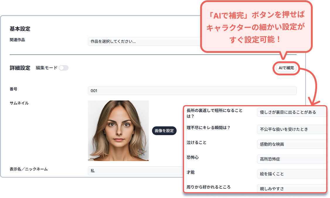 AI quickly generates detailed character settings that previously took considerable time. Additionally, AI automatically creates thumbnail images matching your characters, making visualization much smoother and easier.